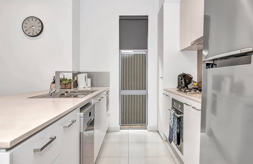 The open-plan kitchen is a culinary enthusiast's dream, equipped with a stone benchtop, spacious walk-in pantry, and stainless steel appliances, including a gas cooktop, electric oven, microwave, coffee pod machine, and dishwasher. Ella House ensures a self-contained living experience with a well-appointed kitchen.