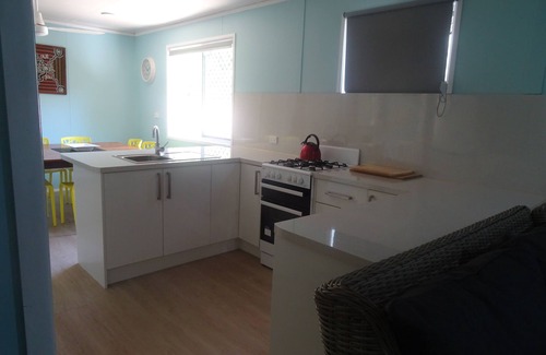Unit 2 sleeps 4, with 1 x QS bed, and 2 single bunks and 1 bathroom. The kitchen has a gas stove and oven, full size fridge and crockery, cutlery, glassware, saucepans, frypans etc. Dining area and sitting room.
