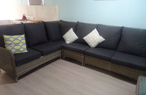 Unit 1 sleeps 8, with 1 x QS bed, 1 x Double, 4 x singles and 1 bathroom. The kitchen is full size, complete with crockery, glassware, cutlery, saucepans, frypans etc. with a full size fridge, gas stove with oven, dining room (seats 8), and a large lounge. Ceiling fans throughout.