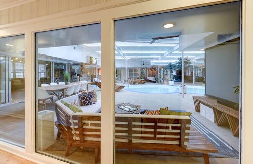 INDOOR LIVING: Heated* indoor guitar shaped pool, game room featuring ping pong/pool table and arcade games, 2 bar areas, 6 Smart TVs, dining table, pool dining table, fireplace, ceiling fans, board games.