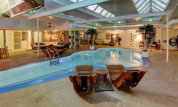 This is a one-of-a-kind house with the ability to sleep 10 guests. Its been reported that Elvis himself stayed here as a guest while touring Kansas City in the early 70s. Our home features a heated indoor guitar shaped pool, which is open year-round for your entertainment. In the pool room, you will find a 120” projector, a dining table, huge 6 burner grill, and many places to lounge around the pool. Additionally, we have a game room with pool/ping pong table, arcade games, wet bar, and a TV.