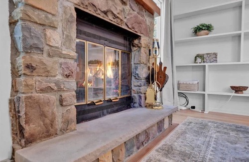 Nestled in gold-star resort community Big Bass Lake, our freshly renovated 2-bedroom, 2-bath cabin offers a perfect blend of modern comfort and nature-inspired charm. With beautiful green accents, stunning tile work, and skylights that bathe the space in natural light, you' ll feel right at home from the moment you step inside.
