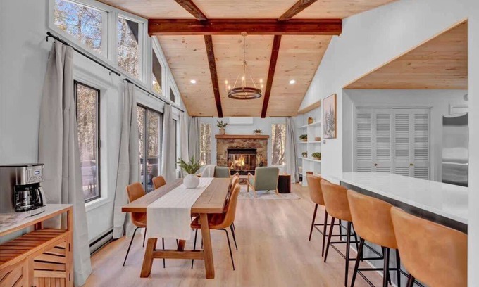 The open concept living area, complete with a cozy fireplace, flows effortlessly into a full kitchen and dining space, making it ideal for family meals or a weekend getaway with friends.