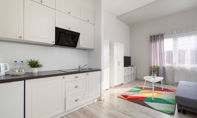 Emilii Plater Studio #60 is a cozy apartment featuring a living room with a sofa bed and a comfortable double bed, a kitchen, and a bathroom. It offers a range of top-class amenities, including free WiFi, terrestrial television, a washing machine, an iron, a hairdryer, an induction cooker, a refrigerator with a freezer, and kitchen accessories.