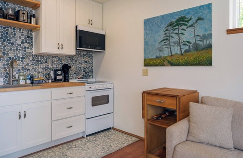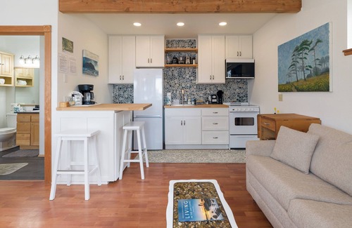 The living room is gracious and adjoins the kitchen eating bar area seating. There is even a sofa bed in this area too. By San Juan County vacation rental permit rules, we are limited to a total of 3 guests. Due to street-front proximity to Emily's Cottage, we are limiting any children to at least 10 years of age.