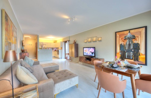 Get away from the busy city life and immerse yourself in timeless pleasures at this 2-bedroom apt with an indoor pool and a garden apartment. The holiday apartment is located on the second floor with lift access. Inside, the large, stylish and lake-view living room creates an ambient atmosphere to instantly relax and enjoy your vacation. This room directly leads out onto a large lake-view terrace and is furnished with ample sofa seating, a Smart TV, indoor dining and a fully equipped kitchen with a dishwasher for a hassle-free holiday.