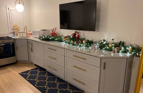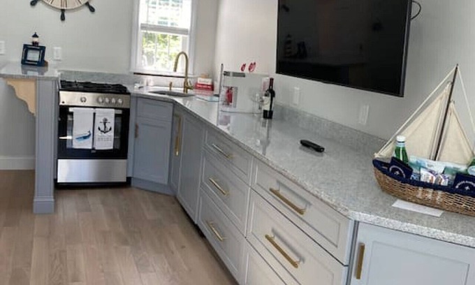 Enjoy this classic cape cod oasis directly across the street from Allan Harbor. This space has a private entrance with a table for 2, where you can sit, relax and enjoy the fresh air off the comfort of your room on the new patio. This is a newly renovated space that has a king size bed with kitchenette that is equipped with stove, oven, microwave and Keurig for coffee. There is a flat screen T.V. on the wall and a mini split A.C. unit and heat. Lastly, a brand new walk in shower with rain head. Linen and towels are provided.