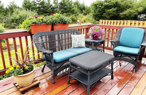 "Work from home" in the upstairs work area with high speed wireless, dual monitors and a printer. The upstairs has an overstuffed chair and ottoman for a private reading space with an ocean view.