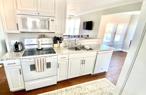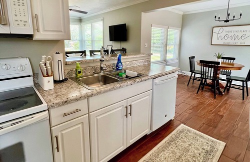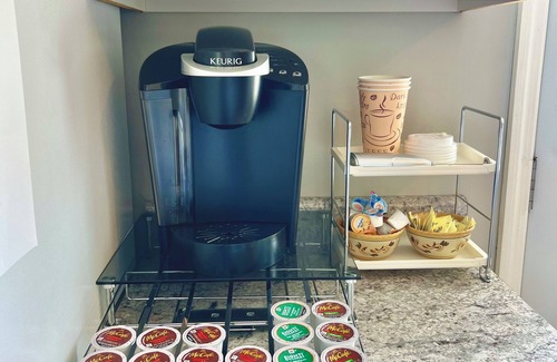 Kitchen is fully equipped for cooking, baking, and dining needs. Enjoy making your coffee with our Keurig coffee maker and standard coffee maker. Coffee pods, coffee grounds, creamer, seasonings, sugar, flour, disposable plates, disposable cups, straws, and more provided. Utensils, pizza cutter, can opener, wine bottle opener, and knives are available in the kitchen. A Crockpot, an Air Fryer, a Kitchen Aid Mixer, a Toaster, a Waffle Iron, Mixing Bowls, and a Blender are available for our guests to use during their stay. Washer/Dryer and Dishwasher available for use during your stay. Tide pods and dryer sheets are provided inside a laundry basket.