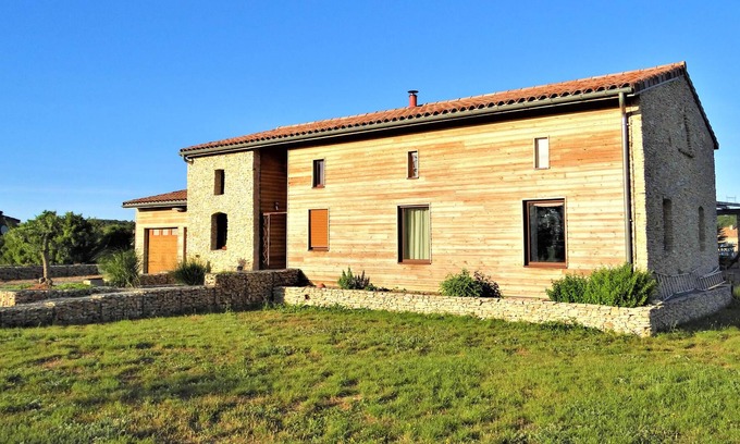 Welcome to the beautiful house in an idyllic location in the heart of the Ardèche in the small village of Larnas, which with its modern interior with bold color accents and many charming details will make it easy for you to relax here from day one. The house was designed according to bioclimatic principles and is intended to be pleasant to live in at any time of the year. Thanks to the large windows, the house is flooded with light and offers complete immersion in its surroundings. Enjoy meals together at the large dining table. Later you can make yourself comfortable on one of the sofas with a movie.