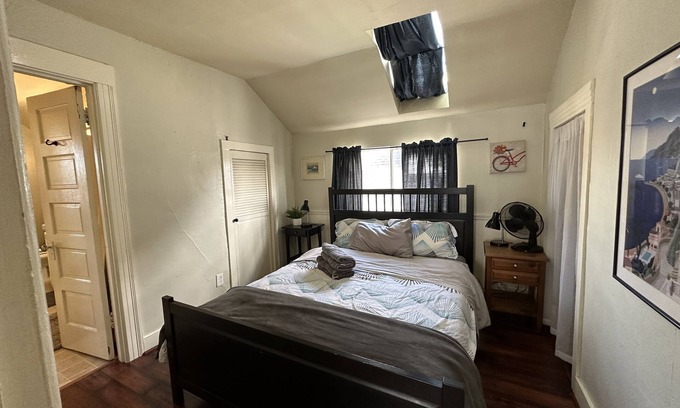 Bedroom 2: Cozy queen bed, skylight (current covered with a shade you can open), window, closet. There is an entrance into the bathroom from this bedroom. There's another entrance to the bathroom from the kitchen.