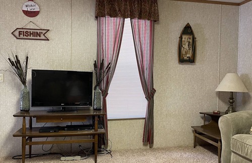 The HUT is a clean, neat single-wide mobile home situated directly across from a cove of the lake with native grasses and cypress trees framing the lake like a picture out of a magazine. The porch faces the west as well as the kitchen, which makes for excellent sunset lake views while enjoying the air conditioning as well.