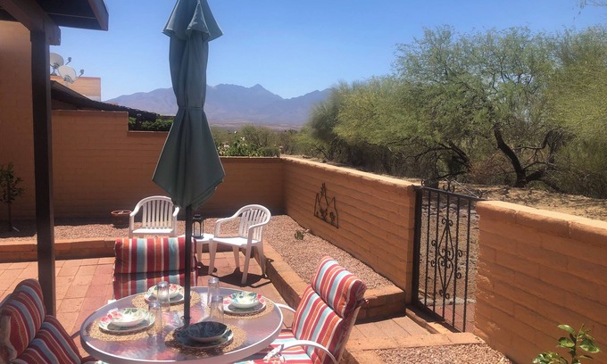 Located in Green Valley Desert Hills III. This Unique Southwestern Inspired Townhome is perfect for Guests looking for a Quiet and Relaxing Getaway with all the Comforts of Home! A Well Appointed, Two Bedroom, Two Bath Townhome with Internet Access, Roku TV, along with various Puzzles and Games. The Arizona Room offers a Sofa Bed for extra Guests. Large Private Patio offers Gorgeous Mountain and Desert Views, Seating for 6 and a Convenient Electric BBQ for Entertaining. Fall in love with Green Valley and enjoy all the Magic it has to offer! Golf Courses, Hiking Opportunities, Local Art and Historical Sites abound! Passes to GVR’s 15 Recreation Centers available for an additional fee. Includes 13 Pools and Spas, with one Salt Water Pool, 6 Fitness Centers, 36 Pickleball Courts, 17 Tennis Courts and so much more! 3 night Stays available May thru September. Snow Bird Rates Available for Extended Stays October thru April. Please note: This is a 55 and older Community. At least one guest is required to be 55 or older. NO EXCEPTIONS.
