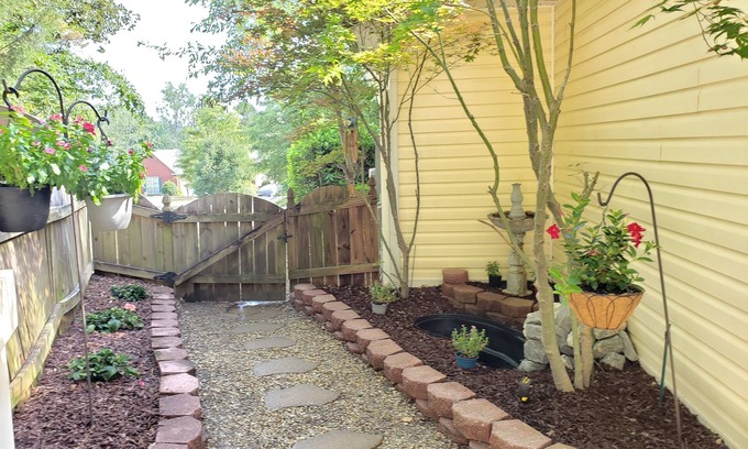Our home is on a gorgeous lot heavily covered by trees and surrounded by nature ( Birds, Deer, Squirrels, ect) we are in a newer upscale community with a back patio courtyard with grill and outdoor furniture and lots of plants/Flowers which makes a beautiful place to relax and enjoying nature. Very comfortable Great Room with large leather sectional , Full Kitchen with Dinning area. Large Master w/ California Kingsize pillow top bed. Second bedroom with Queen size bed and Third bedroom with full size bed and 2 large computer desk making it easy to work from home . All rooms have a t.v. /wifi.