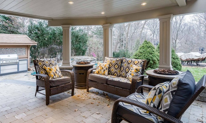 Lie down next to the pool on a hot summers day or lounge around in the covered seating area. The backyard is surrounded by trees and cascades to a ravine, it’s a beautiful sight during any of Canada’s four seasons.