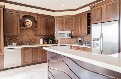 - Kitchen: Fully equipped with high-end appliances, ice maker, mini fridge, breakfast bar with stools, small bar table with ocean views.