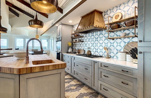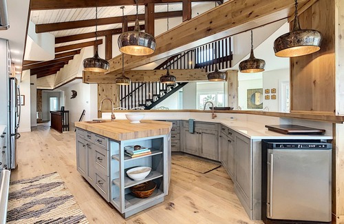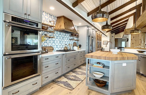 When the whole house is ready for breakfast, feed them from the gourmet kitchen at the custom Florida cypress dining room table and unique knotty alder countertop bar that together seats 15. That's perfect because one of you is cooking the chocolate chip pancakes that are going to fuel the fun for the day. You won't have to make a lot of trips to the grocery store because you can put all your food in the home's 2 full-size refrigerators and full-size chest freezers. Don't worry about getting all those groceries to the third-floor gourmet kitchen because the elevator will do the job for you. And by the way, this kitchen is made for the serious chef. You will find top-shelf cookware and knives to help you put food on the table for your big family gathering. And if you prefer to cook on a gas grill, there is one on the third-floor deck right next to the kitchen overlooking the river. It's almost too bad that the view from the kitchen through the 16-foot sliding doors and windows to the west is so gorgeous because the view of the kitchen is pretty special in its own right.