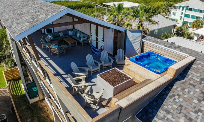 Escape to paradise and enjoy this one-of-a-kind vacation home located in New Smyrna Beach, Florida. As you walk up to "Redfish Dance” for the first time, you will begin to feel what this home is all about - fun with family and friends focused on the wonderful surfing, fishing, kayaking, paddle boarding, boating, swimming, and all sorts of fun beach, river, and outdoor activities. This house is perfectly situated on a narrow stretch of the island, with the walk to the beach not much farther than the walk to the end of the dock. And when you are tired at the end of the day from all the fun at your doorstep, enjoy the sunset, watch the dolphins from your private rooftop bar and take in the best view in New Smyrna Beach with 180-degree uninterrupted sunset views on one side and ocean views on the other.