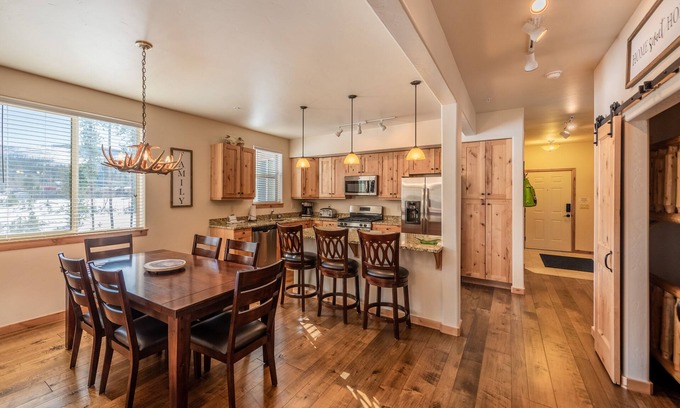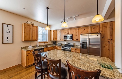 INTERIOR: The condo features 2 full bedrooms and a bunk room. The master bedroom features a private bathroom and NEW furniture complete with a pillowtop King bed. The 2nd bedroom also has NEW furniture complete with NEW King memory foam mattress. There is also a bunk room with 4 additional twin beds configured in a log cabin style quad bunk, which provides cute, cozy sleeping quarters for the children in your party. The spacious kitchen allows for your family to cook in the unit. A full dining table as well as a countertop dining area provides plenty of space for gathering for a meal. The roomy living room features a gas fireplace with stone surround and plenty of comfortable furniture for your family. This condo has recently been outfitted with more than 40 hooks so you can keep ski equipment organized and dry. There is also a full size washer and dryer in the unit in case anything needs to be laundered during your stay. Boot warmer, drying racks, games... we have covered all the details!