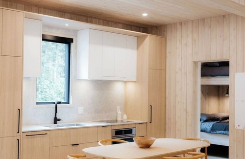 The cabin is modern but cozy, and provides a private getaway with forest views.