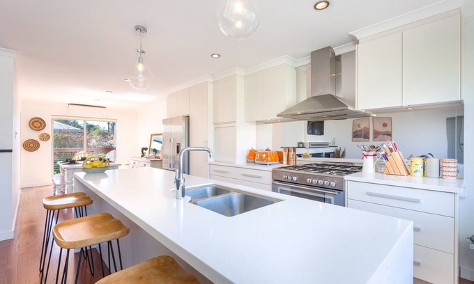 A romantic fireplace helps warm the house for the chilly nights keeping you cozy and the well-appointed kitchen with large oven, stocked with basic needs (tea, coffee, oil, herbs), flows seamlessly to the dining space with an 8 seater table to entertain. Double doors lead out to a cute alfresco area overlooking the generous and immaculate backyard, a great space to watch the kids kicking the footy.