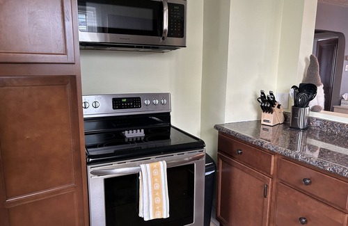 The house itself will provide you with the space you'll need to feel right at home. It has a full size kitchen stocked with the tools you'll need if you choose a home cooked meal. There are two bedrooms; both offering queen size beds with dressers.