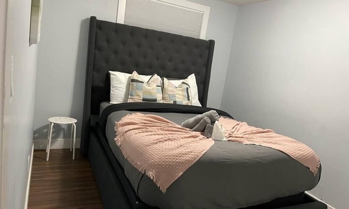 This is a beautiful one bedroom basement which welcomes everyone. This place comes with spacious private area/living room ever in any basement suite. The beautiful room has a very comfy bed where you’ll enjoy the most wonderful sleep. The shower has an excellent water pressure. There is an office desk and office chair for remote work comfort. Fastest WiFi ever. While there is no kitchen, you have access to your own microwave and mini fridge.