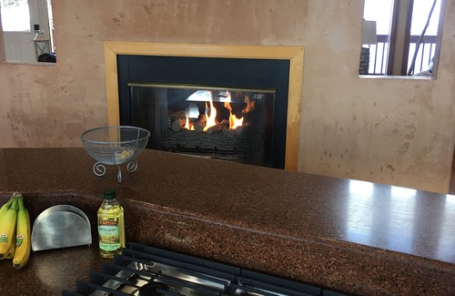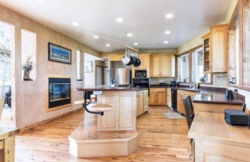Inside the cozy authentic ranch house offers classic western hospitality and country western living. Soaring ceilings and large cathedral style windows on both sides of the house enhance the spectacular views while the two-story central fireplace keeps you warm and cozy throughout your stay. The open kitchen has brand new stainless steel appliances. The kitchen gas range and the outside deck barbecue are perfect for all family style meals. Enjoy plush bedding and pillows throughout the spacious home on the range.