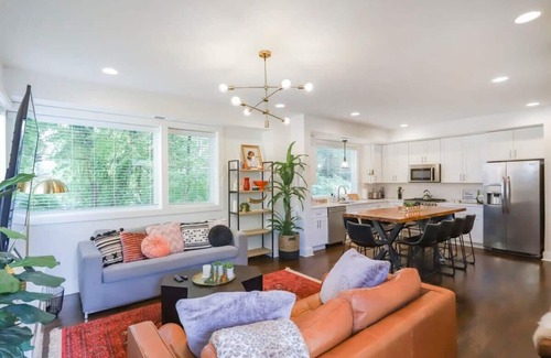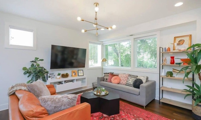 Experience Nashville in style at our elegantly decorated retreat, perfectly situated 0.5 miles from Belmont University. Stroll to local eateries, coffee shops, and boutiques, with a brand-new Publix just next door. Unwind in four beautifully appointed bedrooms with en-suite bathrooms, and gather in the vibrant open-concept living room and kitchen, ideal for large groups.