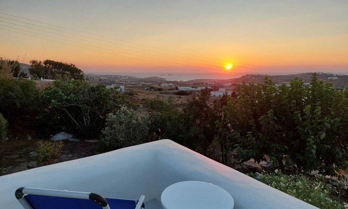 Cosy, best quality construction 60sq.m Cycladic style with sunset view from terrace. Light and airy with very large master bedroom (with king bed) with A/C and music system. Living room and hall where another there can sleep. Two toilets, 1 shower. New kitchen with all amenities. Roof terrace with spectacular view.