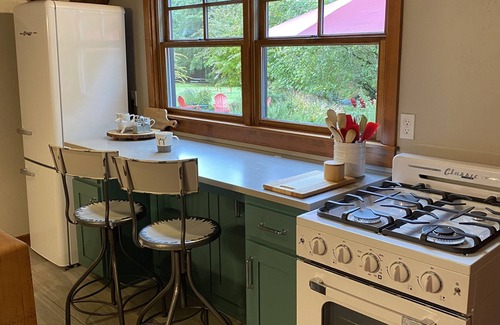 There is a well equipped kitchen. It includes a small convection oven, microwave, full size Retro refrigerator and Retro Propane Range, and dishwasher,