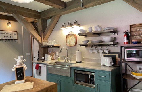 It is also outfitted with cooking utensils, pots, pans, dishes, immersion blender, small electric mixer, waffle iron, etc.