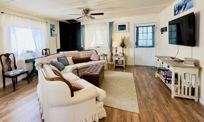 - In the living area, you'll find a 55" wall-mounted smart TV with all major streaming apps, ensuring that you never miss your favorite shows or movies. The large, comfy antique sofa is perfect for relaxing and unwinding after a long day of adventure. If you're traveling with a furry friend, we have pet sofa covers and doggie rugs available for their comfort. We also have a wide selection of board games and family games for all ages, guaranteeing fun-filled evenings.