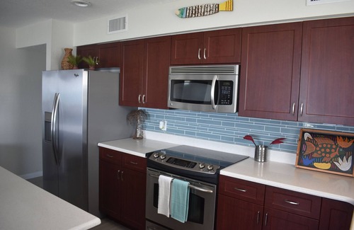 This Villa features white kitchen cabinets and a 32" soaker bathtub. It is located on the second floor on the south side.