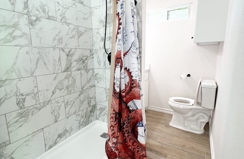 Modern Bathroom: Refresh and rejuvenate in our modern bathroom equipped with all the essentials. Start your day with a refreshing shower. Fresh towels and toiletries are provided for your convenience.