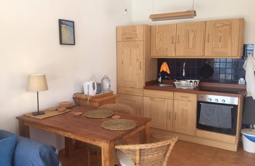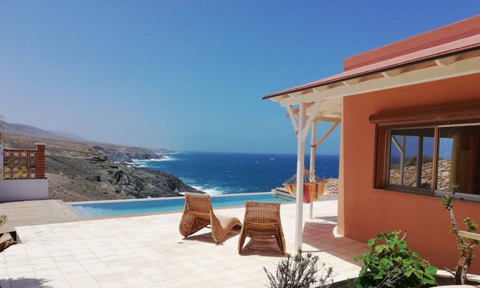 On the west coast of Fuerteventura, far from civilization and tourist areas is Casa Evelmar where you can enjoy an experience near to live in a lighthouse with the waves and the sea breaking at your feet and breathtaking views of the west coast of Fuerteventura The house has a pool, terrace and patio on the seafront with spectacular panoramic views of the coast, sea and mountains of the Betancuria Natural Park. Hidden place without any traffic and with absolute tranquility. It consists of a room with double bed, bathroom and living room kitchen.