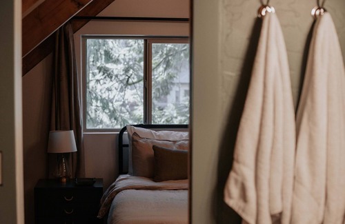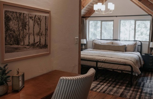 Evergreen Escape has room to sleep 8 - the upstairs, primary bedroom in a loft setting has a king bed with a full bathroom. The main level features two bedrooms, both with queen beds, and a bathroom with a large shower that doubles as a steam room. The downstairs is a quaint media room that feels like a study but is complete with a projector screen for TV & movies, plus a queen size pull out couch.