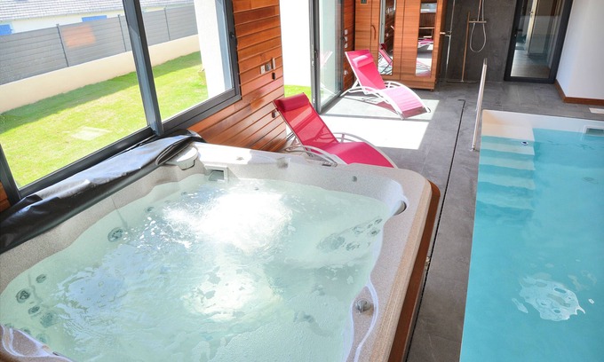 - private aquatic relaxation area with heated swimming pool, 3-person sauna and 5/6 person spa, shower, TV with TNT channels. Large picture window overlooking the garden. Seaview.
