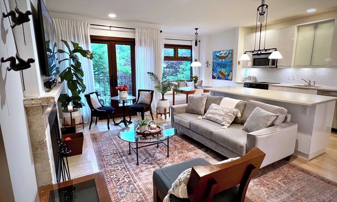 The townhouse interior has light hardwood floors at the entrance and in the main living and dining area. Furnishings are a blend of contemporary & antiques, all comfortable and positioned to function optimally. The kitchen is well appointed with excellent appliances, cooking tools, table wear, glassware and cutlery. The dining room is situated in a bright nook in the front window and will seat 6-8 comfortably (additional leaf available for table). There is a large 'Smart TV' (internet capable) over a wood-burning fireplace and original artworks that create a warm and inviting place to relax. WIFI internet, telephone, cable, and Netflix are all included.