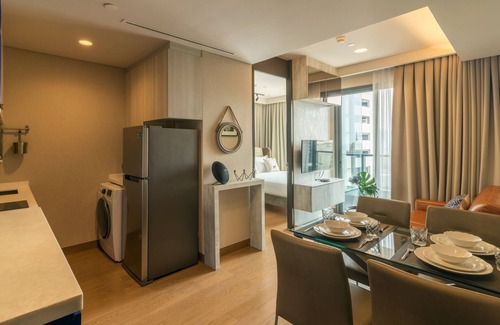 This newly one bedroom at the high-rise condominium building comes with fully equipped modern kitchen appliances and excellent cookware. Cosy bedroom, bathroom, stylish open-plan kitchen and living room with small balcony. It is safe and comfortable with an excellent location. Perfect for all types of Bangkok visitors, whether here on business or leisure.