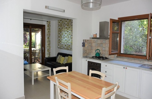 This apartment is in a recently built house, with attention to details, comfort. The bedrooms are in the back of the apartment and are spacious, cool (for the hot days) and quiet. The double room with double bed has a balcony with a view of the Supramonte. To separate the bedrooms from the rest of the apartment, there is a small hallway, which leads to the bathroom with shower, sink, toilet, bidet. The kitchen with a view of the garden can easily accommodate 4 people. From there you can also go directly to the spacious, covered terrace. The tree 'Olivastro' provides shade. The terrace was built in typical Sardinian style by a local craftsman. There are loungers in the garden to enjoy a good book. There is also a fireplace and garden chairs behind the house. This apartment is ideal because it is practical for a family.