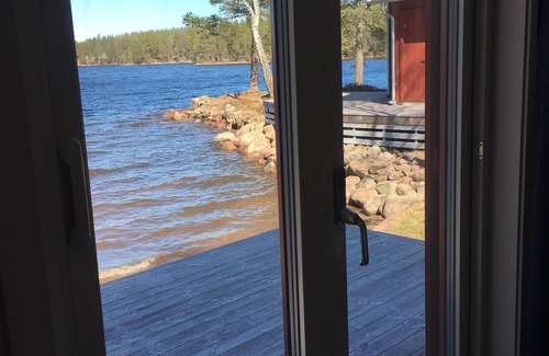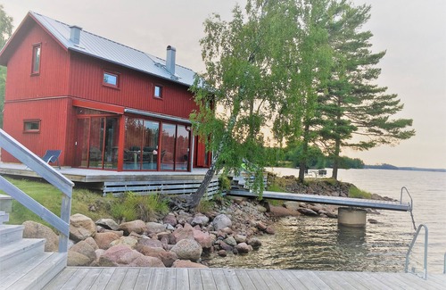 This stunning holiday home with guest house is located on a small peninsula on a cape almost completely surrounded by water. Around the house there is a wooden deck and, on cooler weather, allows the glazed veranda close to nature. There are two private private docks with ladders right next to the house as well as a beach with its own boat.