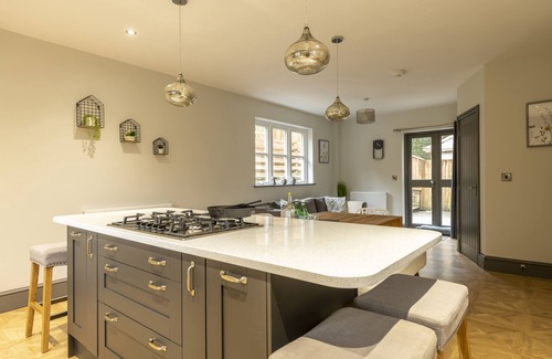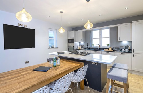 2 North Lodge: ground floor has large kitchen/diner/lounge which easily accommodates 10 to eat on island granite worktop, and dining table in addition to this there is a large sofa and ambi light smart TV making this is brilliant area to gather relax in comfort.