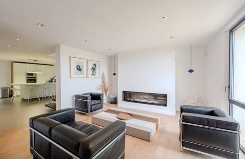 A spacious 100 m² living area with seating for 13, fireplace, flat-screen TV, and large bay windows opening onto the terraces.