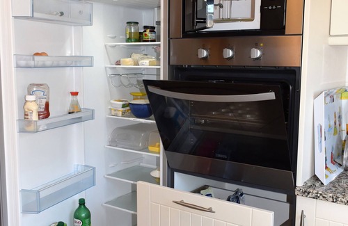 The combined living/dining room is equipped with a well-equipped kitchenette with oven, electric hob, fridge and dishwasher. The dining table is extendable.