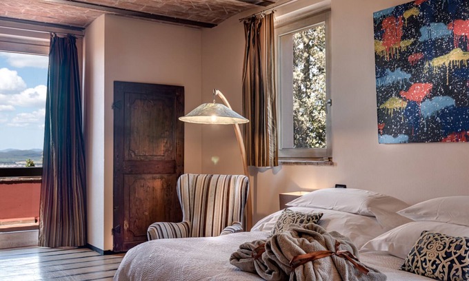 Villa Vedetta represents the ideal place to relax and discover the Tuscan Maremma. In its Rosso Toscano it dominates the different landscapes from the sea, from the medieval village of Scarlino and offers 6 large rooms with private bathroom, some with terrace or private garden. All have a king size double bed, TV with SKY, the bathrooms, all with stone mosaic bathtubs, are large and original and naturally lit with windows.