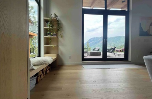 This is a luxury built home with all the modern amenities including wall oven, steam oven, induction stove, dishwasher and Italian built cabinetry and integrated appliances with a beautiful Dekton Stone countertop and backsplash. The home features built in speakers in the living room, dining room area , and balcony. The seamless 800 SF balcony ties into the home which provides tons of natural light year round. The home features a stuv wooden fireplace, hidden television entertainment area, window bench seat, and all furniture are from blu dot, King Furniture, and design within reach. There are white oak hardwood floors throughout with designer lighting. In the front yard, there is an outdoor firepit area and open parking for 3 or more cars. You will also have access to an attached garage. The home features 3 bedrooms (one King size bed with Endy Matresss), ( one queen bed with Endy Mattress) and third bedroom is a bunk bed (double bed on bottom and single on top with a roll out trundle bed too). The entire home is approximate 1,800 SF on two levels. The views are jaw dropping with the Mountains and water. This is a quiet area and from the balcony you will enjoy hearing the birds chirp and amazing evening star gazing!
