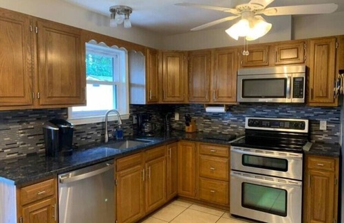 Discover the delightful five-bedroom getaway nestled right within Hollins town. It's conveniently close to the lively Hollins University, the busy Valley View Mall, and the artistic Center in the Square. As you step inside, you'll be greeted by a fully stocked kitchen, complete with a stove, oven, refrigerator, microwave, dishwasher, blender, toaster, and ice maker, allowing you to easily prepare delicious meals. Gather around the dining table and enjoy quality time with your loved ones. When it's time to unwind, retreat to the cozy living room and catch up on your favorite shows on the smart TV, or take advantage of the free WiFi to stay connected. Freshen up in the two bathrooms, where you'll find towels, basic soaps, and a hair dryer, and keep your clothes clean with the convenient washing machine and dryer. Stay comfortable year-round with the air conditioning and heating, and enjoy the added convenience of an iron and ironing board. Whether you need to get some work done or simply relax, the desk and chair in the office space provide the perfect setting. With ample parking available, you can explore the surrounding area with ease. Immerse yourself in the vibrant local culture and discover the nearby attractions, including the renowned Hollins University, the bustling Valley View Mall, and the captivating Center in the Square. Embark on an unforgettable vacation in our charming 5-bedroom home, where comfort, convenience, and exploration await.