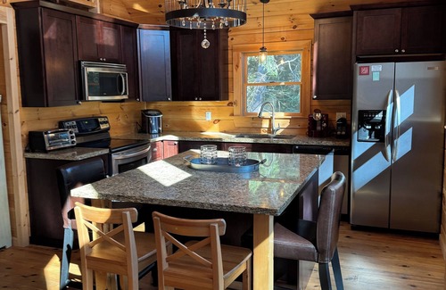 • Living and Dining Area: An expansive open-concept space featuring a wood-burning stove, perfect for cozying up during cooler evenings. The large kitchen island provides ample space for meal preparation and casual dining.