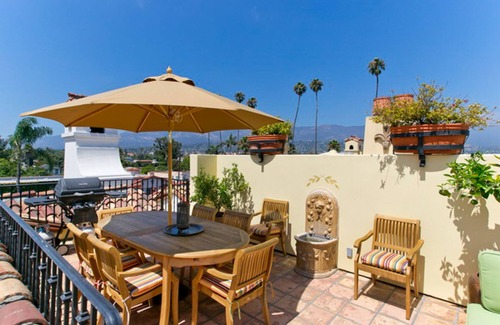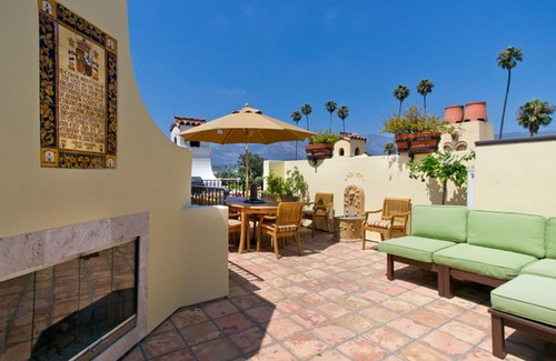 The roof deck, with sweeping views of the American Riviera and glistening Pacific Ocean, provides that extra outdoor living space for fresh-air dining or just relaxing and enjoying the sun and sea breezes. There is an outdoor fireplace on this deck inlaid with a hand painted Spanish mural, a separate fountain and 360 degree views of all that Santa Barbara has to offer.